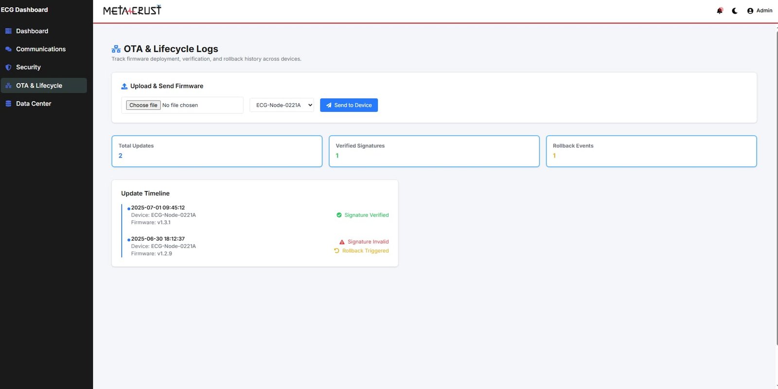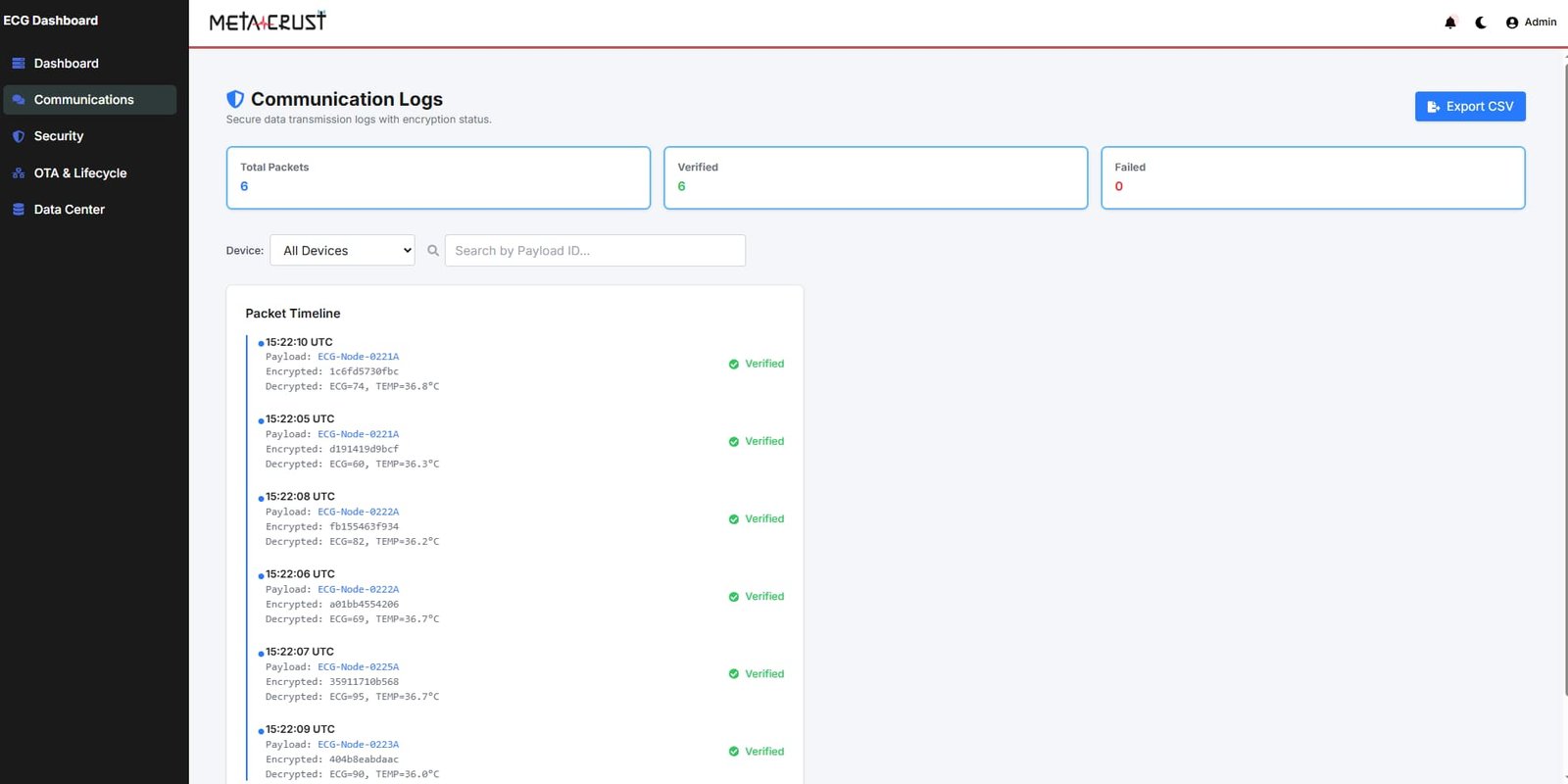 Real-time ECG monitoring dashboard with AWS IoT Core integration and encryption.