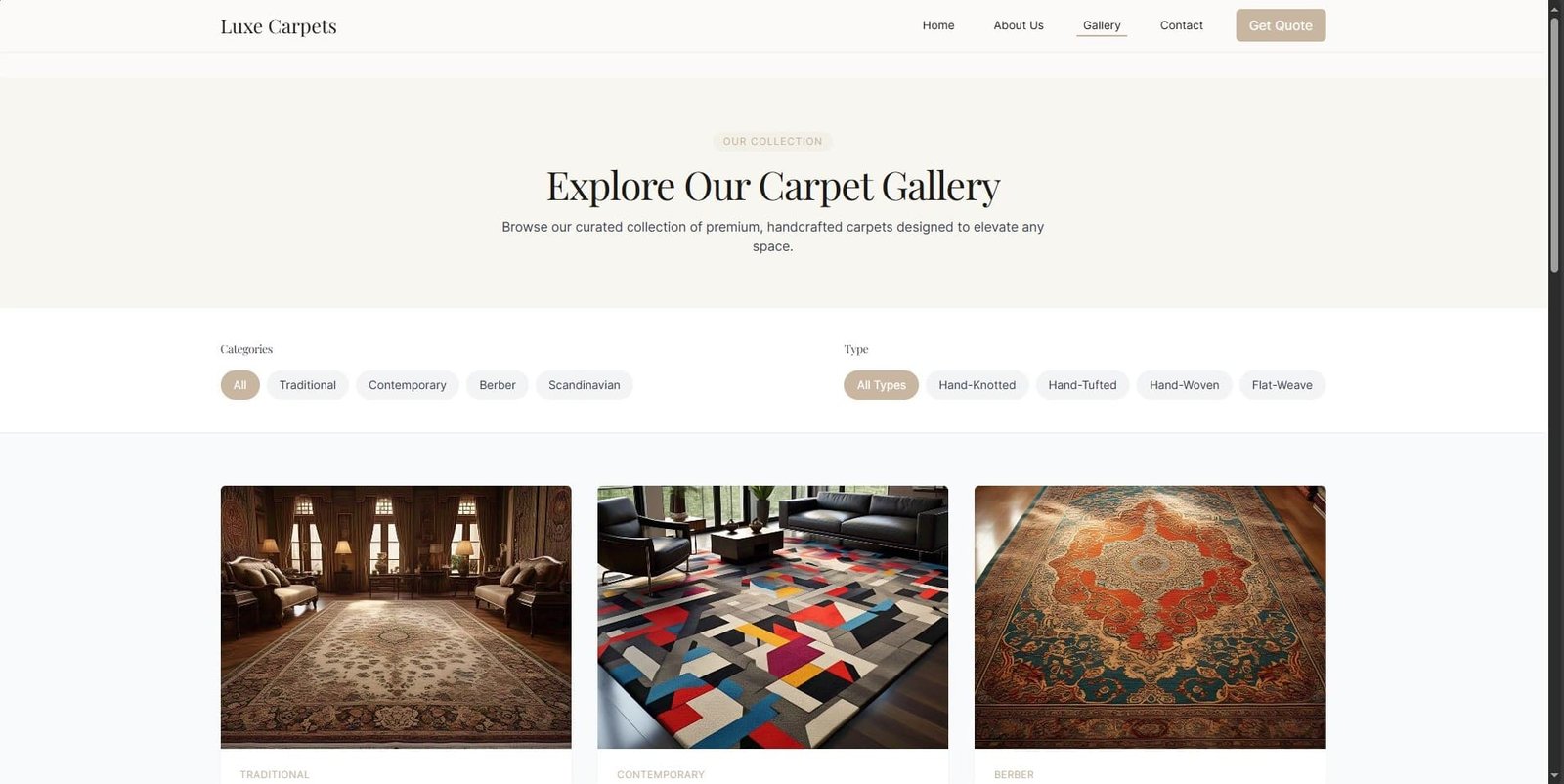 Premium e-commerce platform for handcrafted artisan carpets with category filtering.