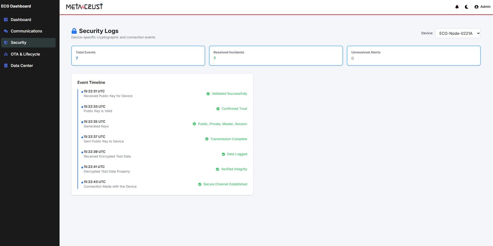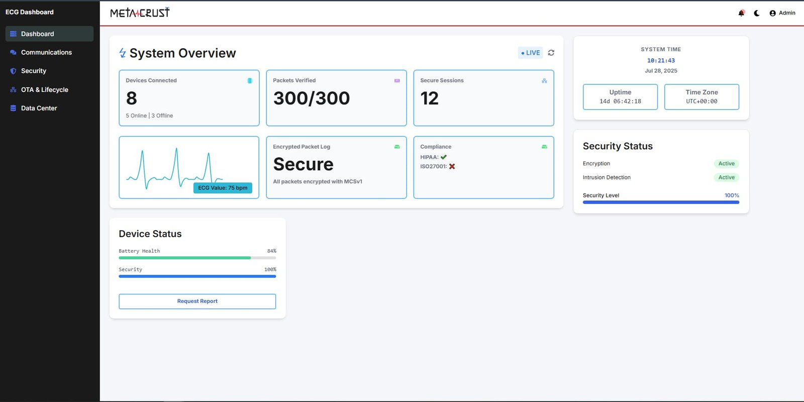 Real-time ECG monitoring dashboard with AWS IoT Core integration and encryption.